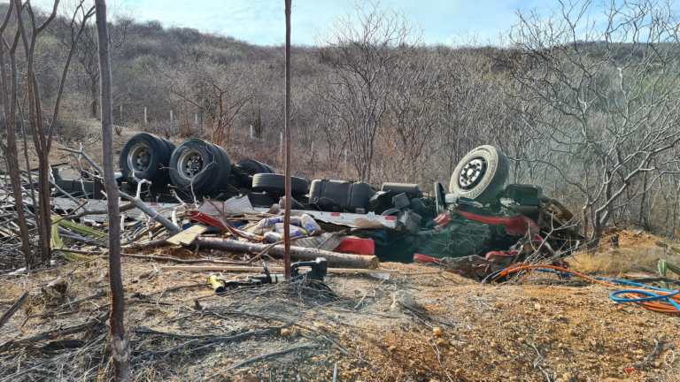 Caminhão capota na Serra de Santa Luzia e motorista fica preso às ferragens. Vídeo