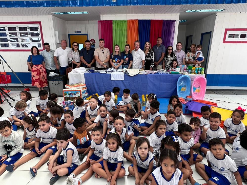 Além da farda, o prefeito juntamente com a secretária Adriana Carneiro, e na presença de representantes do legislativo, fez também a entrega dos materiais de higiene pessoal dos alunos.