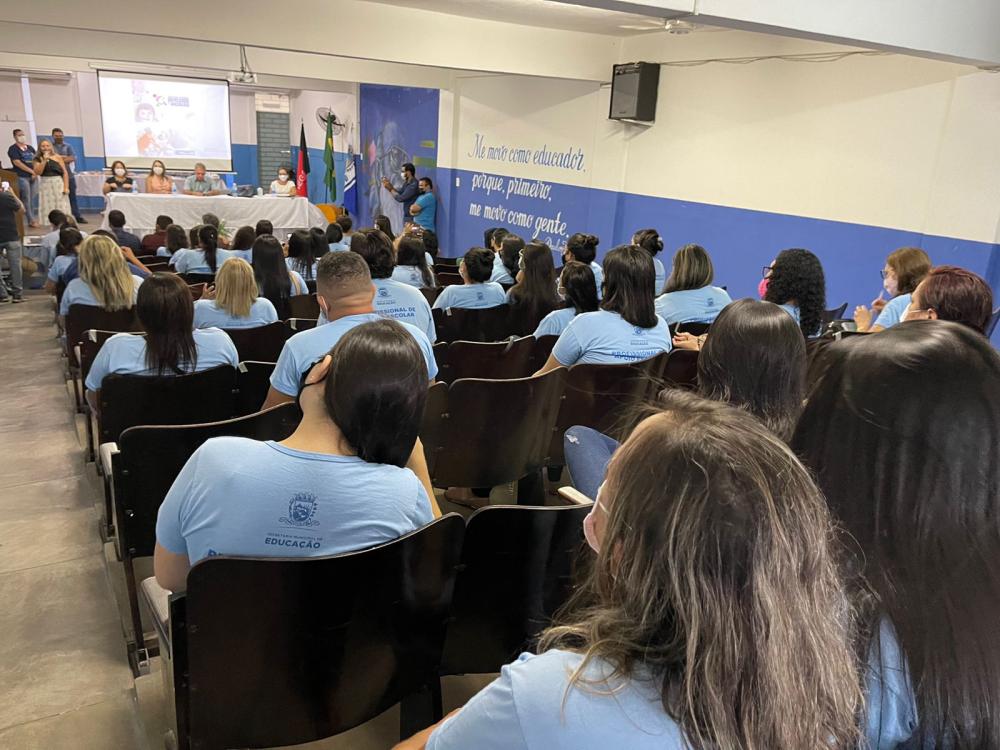 Diversas autoridades municipais entre secretários de governo e vereadores estiveram presentes na manhã de lançamento da iniciativa, que também contou com a presença de parte dos profissionais de apoio escolar do município.