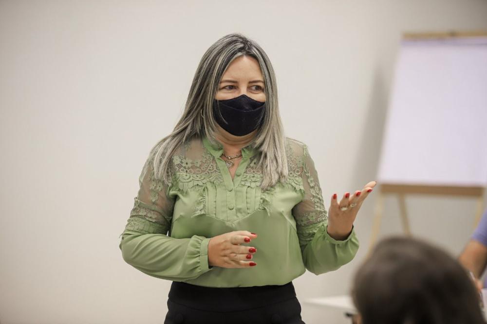 Secretária de Educação Adriana Carneiro com sua equipe e convidado durante o evento