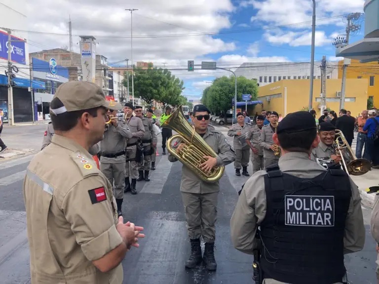 Durante o Hasteamento do Pavilhão Nacional, a Filarmônica 26 de Julho contou com o apoio da banda de música do 3º BPM.