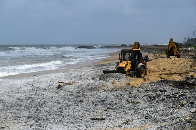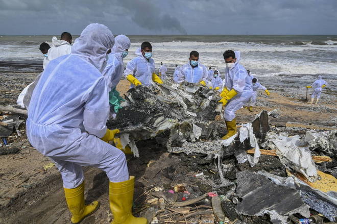 A Marinha do Sri Lanka foi mobilizada, nesta sexta-feira (28), para limpar uma praia da ilha contaminada com toneladas de granulados de polietileno procedente de um porta-contêineres em chamas há nove dias, na altura da capital Colombo, apesar dos esforços feitos para salvar o navio e evitar uma maré negra
