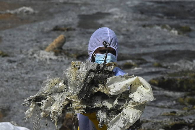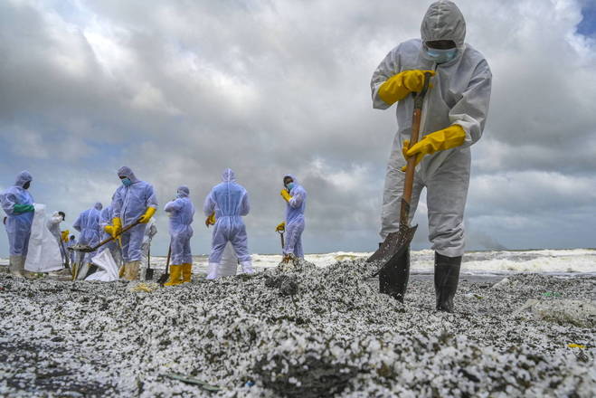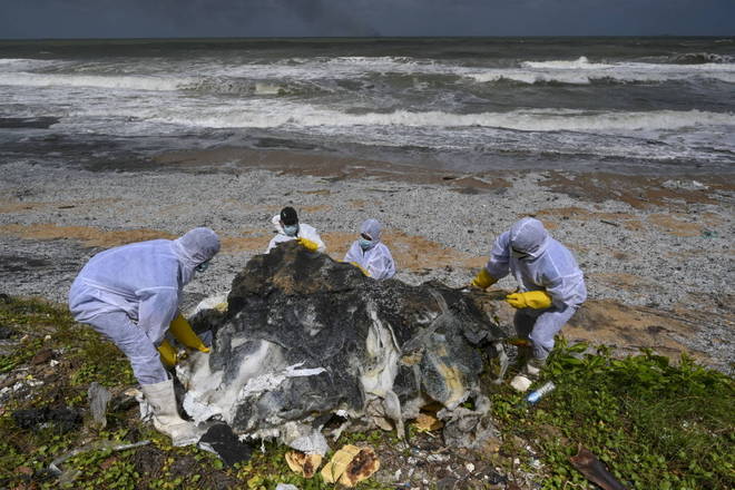 Oito deles caíram na água. Parte dessa carga misturada com petróleo queimado chegou à praia de Negombo