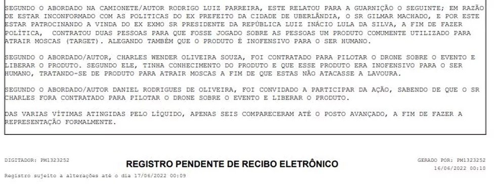 "Este relatou para a guarnição o seguinte: em razão de estar inconformado com as políticas do ex-prefeito da cidade de Uberlândia, o senhor Gilmar Machado, e por este estar patrocinando a vinda do ex-exmo senhor presidente da República, Luiz Inácio Lula da Silva, a fim de fazer política, contratou duas pessoas para que fosse jogado sobre as pessoas um produto comumente utilizado para atrair moscas (target)", diz trecho extraído do boletim.
