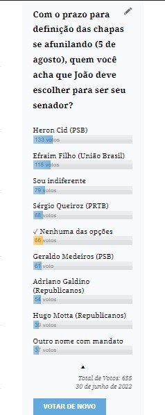 A polarização dos internautas fica entre os dois, tendo em vista que a terceira opção mais votada para o questionamento: “Com o prazo para definição das chapas se afunilando (5 de agosto), quem você acha que João deve escolher para ser seu senador?” foi – Sou indiferente.
