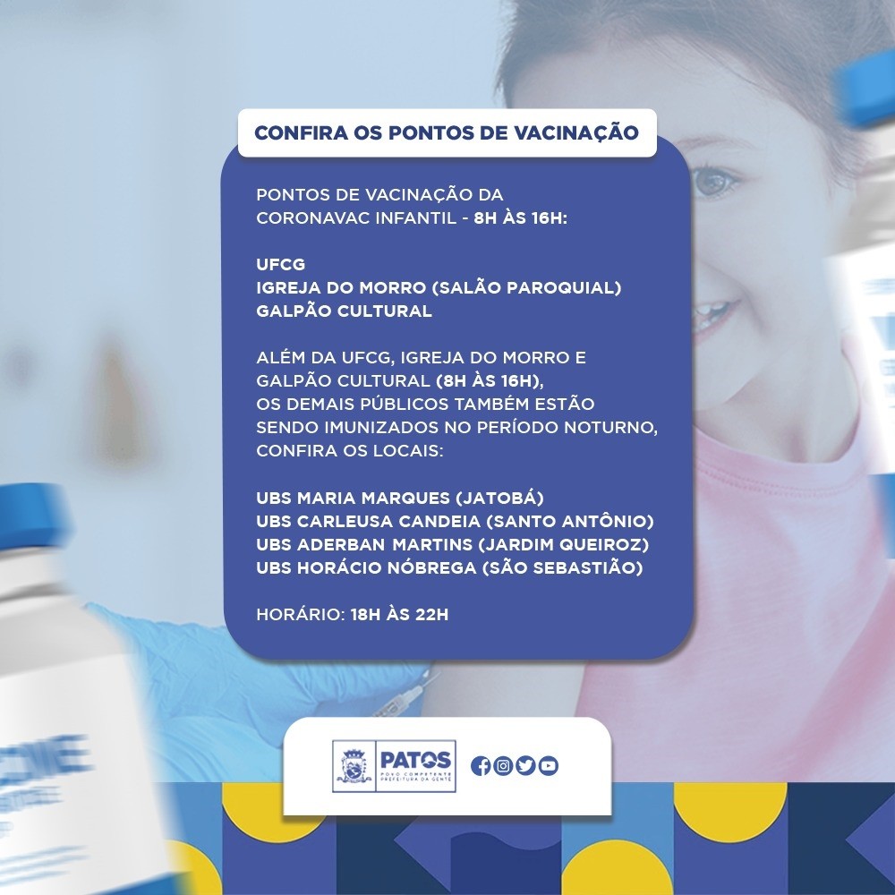 Vale frisar que a cidade de Patos recebeu inicialmente 300 doses para a primeira etapa da vacinação deste público. Conforme chegada de novas doses, a imunização das crianças com 4 anos terá continuidade.