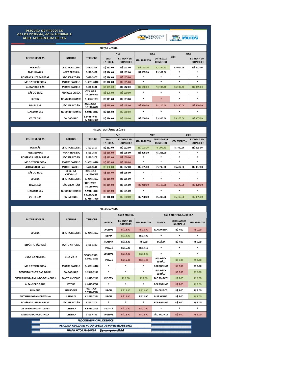 O Procon/Patos realizou, nos dias 09 e 10 de novembro, pesquisa de preço de gás de cozinha, água mineral e água adicionadas de sais.