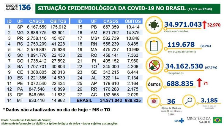 Ainda conforme o boletim, 34.162.530 pessoas se recuperaram da doença e 119.678 casos estão em acompanhamento.