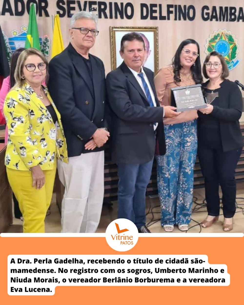 A médica acriana, Perla Gadelha, radicada na cidade de Patos, foi agraciada no dia de ontem (16), com o título de cidadã são-mamedense. Dra. Perla Gadelha fez residência médica pela UNIFIP em São Mamede, onde é médica efetiva do município, é casada com o também médico e são-mamedense Umberto Joubert. A solenidade da entrega do título aconteceu na Câmara Municipal de São Mamede e contou com a presença de autoridades, familiares e convidados. A propositura foi de autoria da vereadora Eva Lucena.