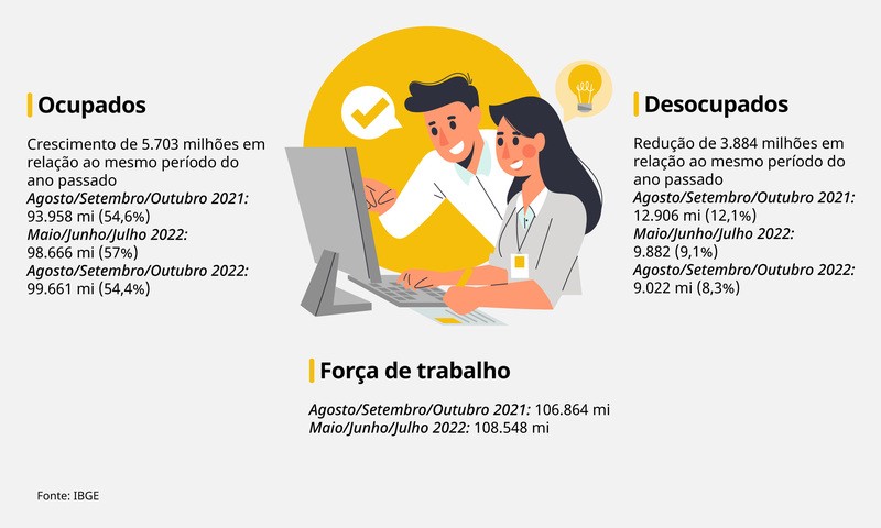 A população ocupada no trimestre é o recorde da série iniciada em 2012. O país conta com 99,7 milhões de pessoas empregadas. Segundo a coordenadora da Pnad, Adriana Beringuy, “este momento de crescimento de ocupação já vem em curso desde o segundo semestre de 2021. Com a aproximação dos últimos meses do ano, período em que historicamente há aumento de geração de emprego, a tendência se mantém”.