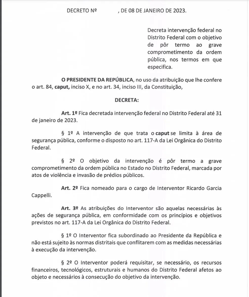 O presidente Luiz Inácio Lula da Silva decretou intervenção federal no Distrito Federal após terroristas invadirem e depredarem as sedes do Palácio do Planalto, do Congresso e do Supremo Tribunal Federal. Segundo Lula, a intervenção é necessária porque policiais militares, que respondem ao governador do DF, Ibaneis Rocha, foram lenientes para conter os manifestantes.