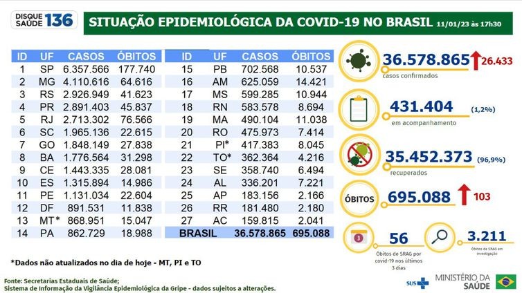 Segundo o boletim,Desde o início da pandemia, 695 mil morreram no país em consequência da covid-19. Casos confirmados passam de 36,5 milhões, e pacientes recuperados são mais de 35 milhões. pessoas se recuperaram da doença e 431.404 casos estão em acompanhamento. O boletim desta quarta-feira não inclui os dados atualizados do Tocantins, de Mato Grosso e do Piauí.