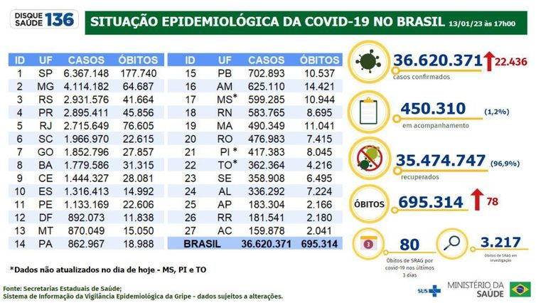 O Brasil registrou, desde o início da pandemia, 695.314 mortes por covid-19, segundo o boletim epidemiológico divulgado hoje (13) pelo Ministério da Saúde. O número total de casos confirmados da doença é de 36.620.371.