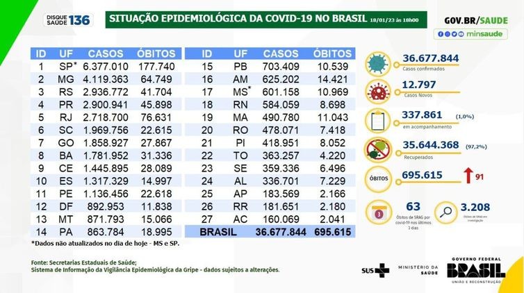 Desde o início da pandemia, o país acumula 36,6 milhões de casos confirmados da covid-19 e 695,6 mil mortes registradas. O número de pacientes recuperados soma 35,6 milhões.