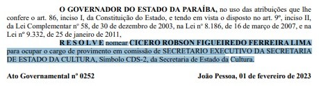 A nomeação foi assinada pelo governador João Azevêdo e publicada no Diário Oficial do Estado. Veja a nomeação do bolsonarista, para a cultura do estado no DOE: file:///C:/Users/Micro/Downloads/Di%C3%A1rio%20Oficial%2002-02-2023.pdf