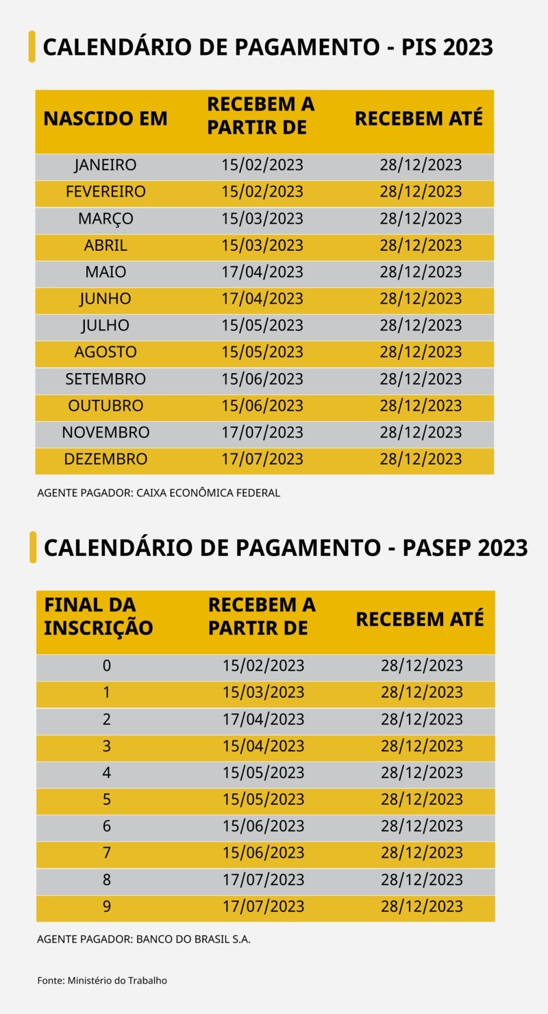 Os pagamentos do abono salarial PIS-Pasep de 2023, que é referente ao ano-base 2021, começaram nesta quarta-feira (15). A estimativa é que cerca de 22,9 milhões de trabalhadores recebam o benefício neste ano, sendo que 20,4 milhões da iniciativa privada devem ganhar pelo pelo Programa de Integração Social (PIS), pago pela Caixa Econômica Federal. Já os outros 2,5 milhões terão direito ao abono pelo Programa de Formação do Patrimônio do Servidor Público (Pasep), recebendo pelo Banco do Brasil.
