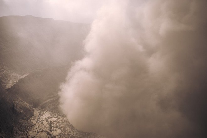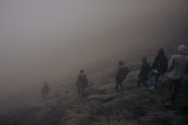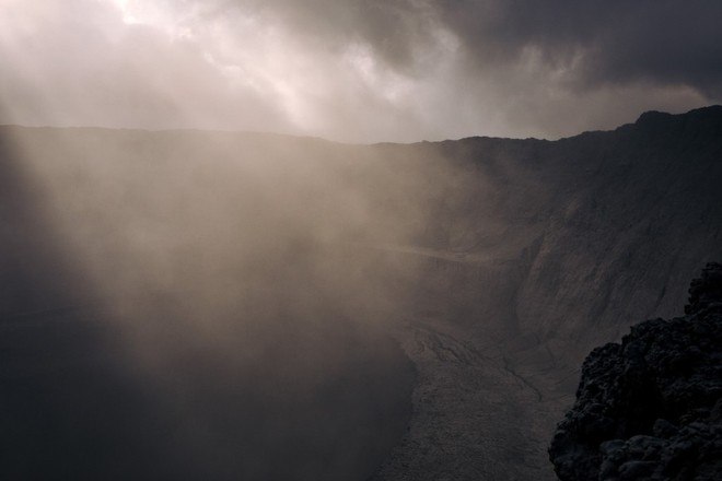 A chegada ao cume forneceu uma visão da cratera, aparentemente perto do colapso. À medida que a noite caía, restos de lava incandescente puderam ser vistos no fundo da cratera