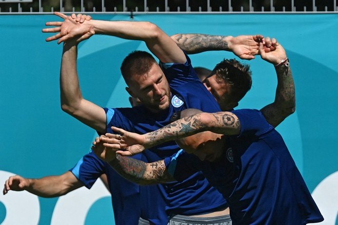 Jogadores da Eslováquia participam de um treino no FC Zenit Training Center em São Petersburgo, na Rússia, antes de um jogo contra a Suécia válido pela Eurocopa
