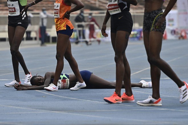 A atleta Margaret Chelimo cai na pista depois de competir na corrida final feminina de 5000 metros durante as seletivas para os Jogos Olímpicos de Tóquio realizadas no estádio Kasarani, em Nairóbi, capital do Quênia
