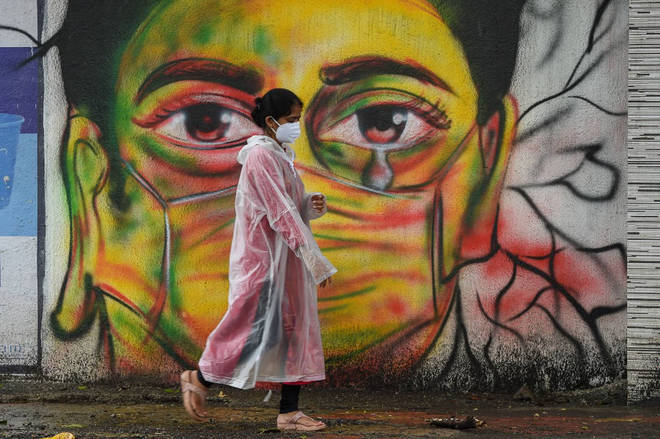 Uma pedestre vestindo uma capa de chuva passa por um mural que mostra uma mulher com uma máscara facial em Mumbai, na Índia
