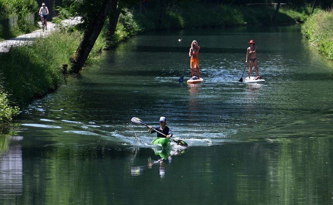 Um homem anda de caiaque na frente de praticantes de stand up paddle no canal Lend em Klagenfurt, na Áustria
