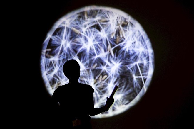 Uma pessoa observa uma obra projetada do artista Jean Otth durante visita a 3 exposições originais no Museu de Belas Artes em Lausanne, na Suíça