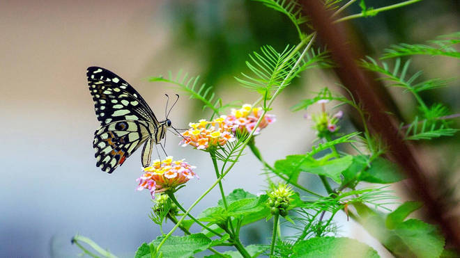 Uma borboleta se alimenta de uma flor em um jardim de telhado em Dhaka, capital de Bangladesh