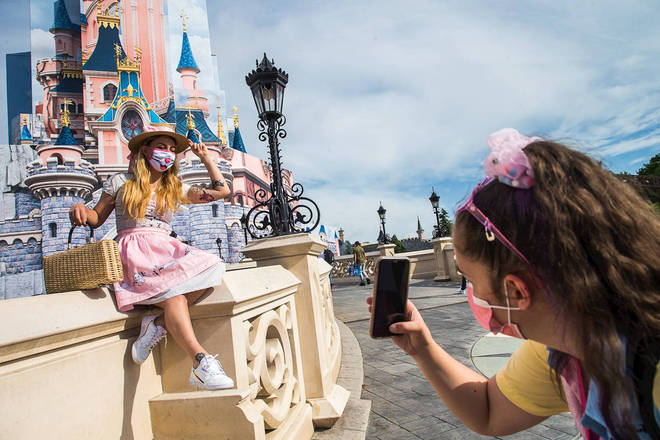 Visitantes usando máscaras tiram fotos em frente ao castelo da Disney localizado em Marne-la-Vallee, na França, no dia da sua reabertura após ser ficar fechado por conta da pandemia