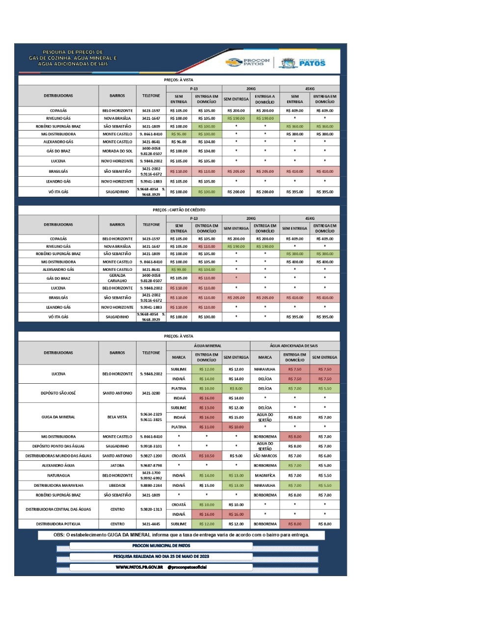 O Procon/Patos realizou, nesta quinta-feira, dia 25 de maio, uma pesquisa do preço do gás de cozinha, água mineral e água adicionadas de sais. Na avaliação a partir da pesquisa, o órgão de defesa do consumidor constatou uma baixa no preço à vista do botijão P-13, sem entrega a domicilio, de 6,86% e, com entrega a domicílio de 7,41%.