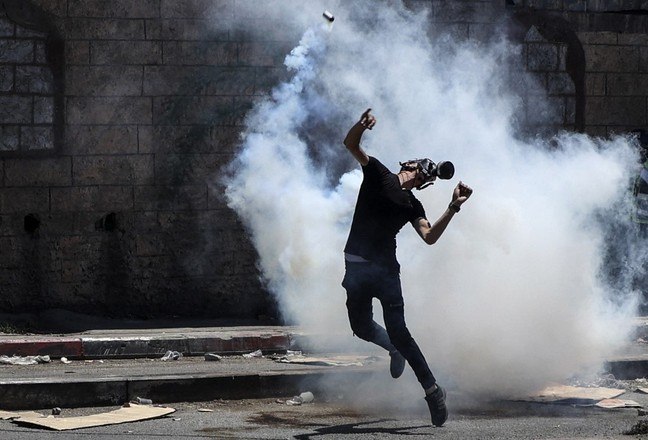 Um manifestante palestino devolve uma bomba de gás lacrimogêneo disparada pelas forças de segurança israelenses durante confrontos após um protesto contra assentamentos israelenses na vila de Beita, perto da cidade ocupada de Nablus, na Cisjordânia