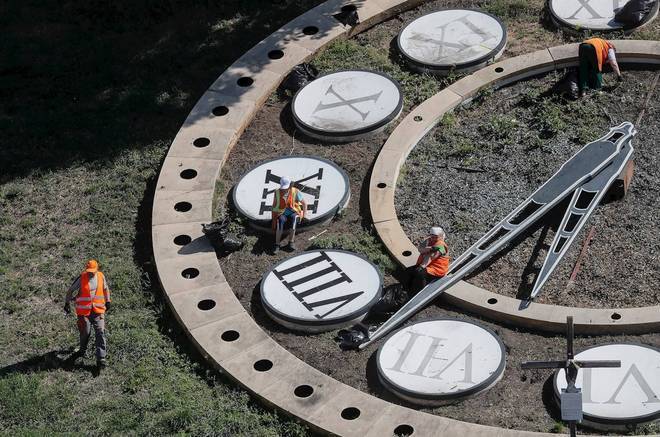 Funcionários municipais limpam um relógio gigante em um parque em Kiev, na Ucrânia