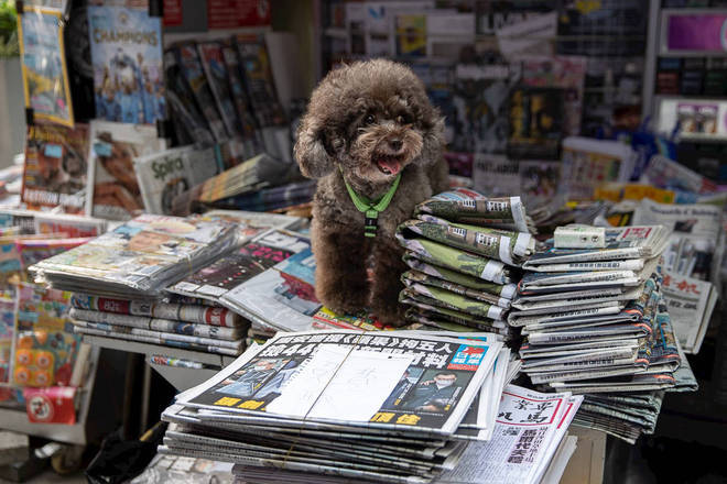 Um poodle ao lado de exemplares do jornal Apple Daily à venda em uma banca de jornal de Hong Kong, na China, 18 de junho de 2021. Policiais prenderam cinco diretores do jornal sob suspeita de conspiração com forças estrangeiras sob a legislação imposta pela China