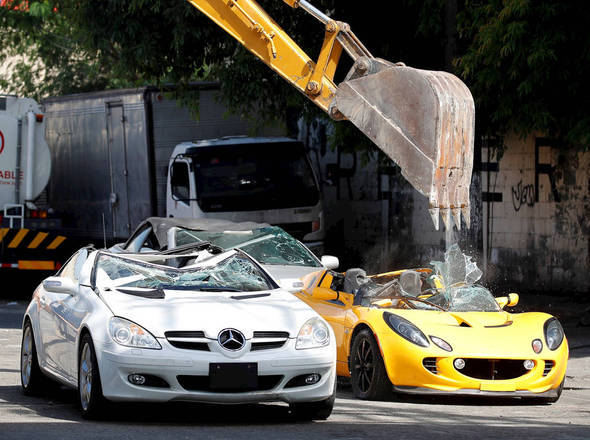 Uma retroescavadeira destrói carros de luxo contrabandeados no Bureau of Customs, em Manila, nas Filipinas