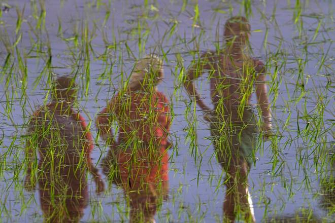 Agricultores voltam de um campo após o plantio de arroz em Khokana, no Nepal