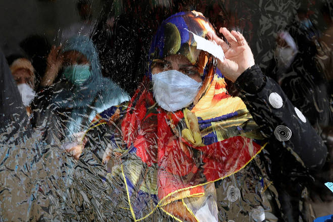Uma mulher iraniana é vista através de uma folha de plástico enquanto espera para votar em uma seção eleitoral durante as eleições presidenciais em Teerã, no Irã