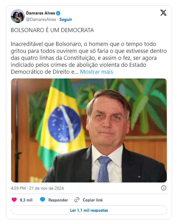A senadora Damares Alves (Republicanos-DF) chamou Bolsonaro de “democrata”. “Inacreditável que Bolsonaro, o homem que o tempo todo gritou para todos ouvirem que só faria o que estivesse dentro das quatro linhas da Constituição, e assim o fez, ser agora indiciado pelos crimes de abolição violenta do Estado Democrático de Direito e golpe de Estado."