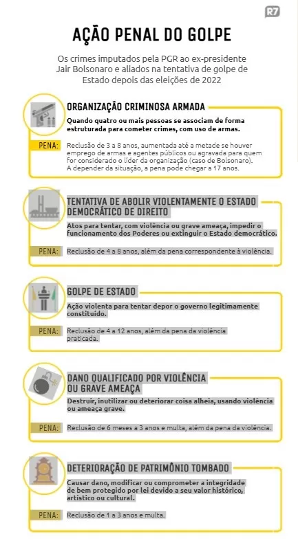 Os crimes atribuídos a Bolsonaro e a seus aliados são: