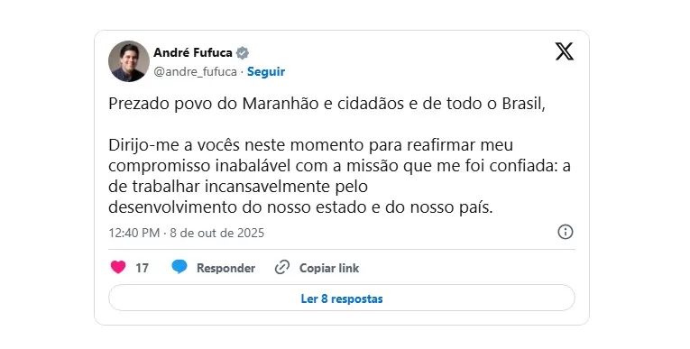 “O meu trabalho e a minha atuação estão, inequivocamente, acima de quaisquer questões e disputas partidárias internas. A pauta do desenvolvimento social e econômico do Maranhão e do Brasil está acima de quaisquer divergências”, completou Fufuca.