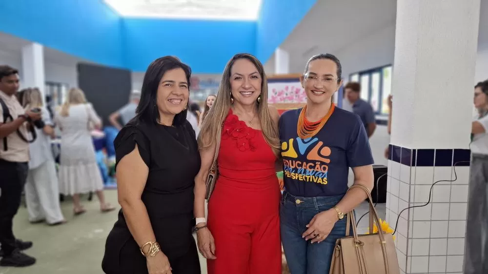 Representantes do Legislativo e da Educação Municipal: A Presidente da Câmara, Tide Eduardo, a Diretora Cristianne e a Chefe de Gabinete Jordânia Araújo celebram a inauguração do novo CEI na Rua do Prado.