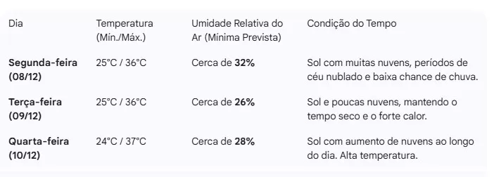 A umidade relativa do ar na cidade deve se manter em níveis próximos aos limites do alerta (entre 20% e 30%) ao longo das tardes, com as temperaturas máximas atingindo picos.