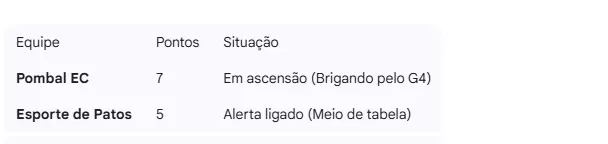 O resultado marca uma troca de posições direta. O Pombal, que antes olhava para a parte de baixo, agora chega aos 7 pontos e dá um salto importante em busca do G4. Já o Esporte de Patos estaciona nos 5 pontos e precisará recuperar o prejuízo fora de casa para não se distanciar dos líderes.