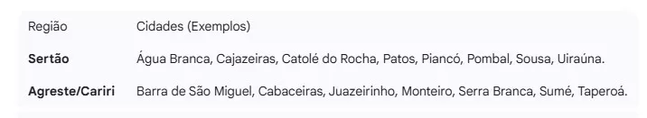 A lista abrange uma vasta área do estado, incluindo polos regionais como Patos, Sousa e Cajazeiras: