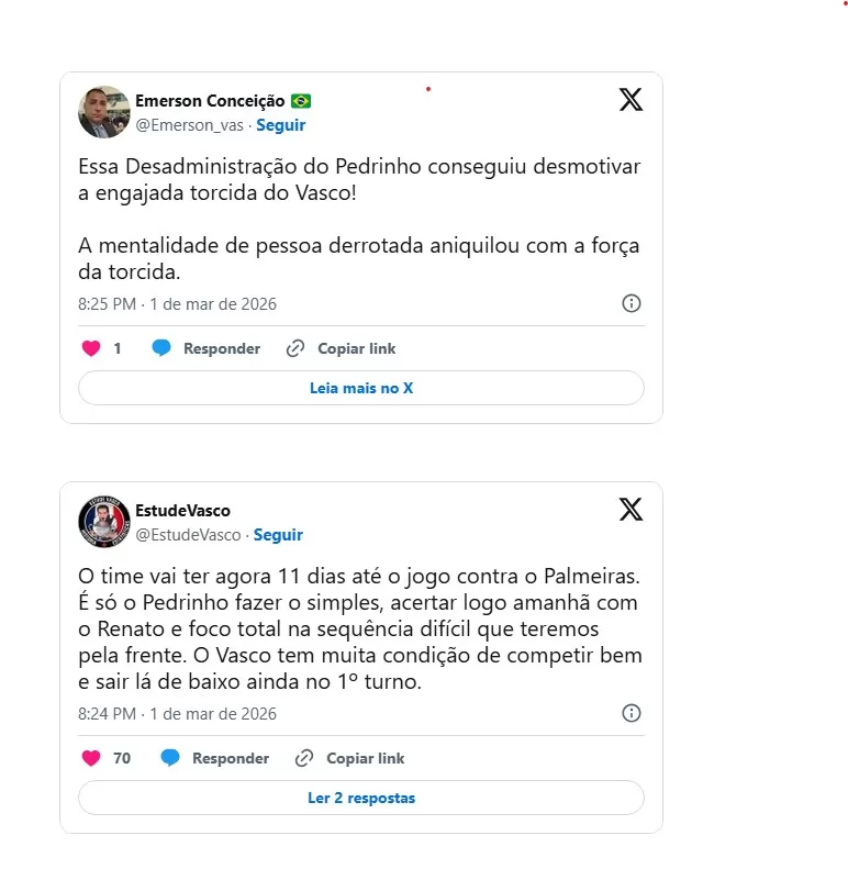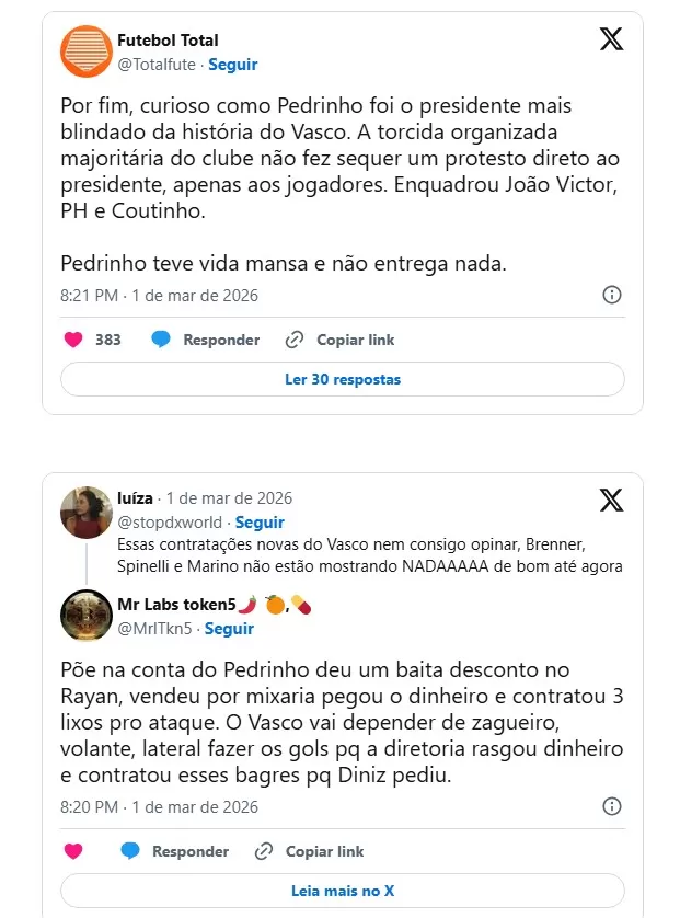 Nas redes sociais, muitos torcedores do Vasco aproveitaram a eliminação para tecer algumas críticas ao presidente Pedrinho. Veja os comentários abaixo: