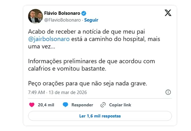 A informação foi divulgada pelo senador Flávio Bolsonaro (PL-RJ), por meio de publicação na rede social X, que contou que seu pai apresentava calafrios e episódios de vômito.
