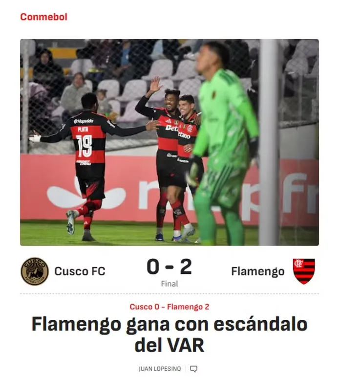 A vitória do Flamengo sobre o Cusco por 2 a 0, pela primeira rodada da fase de grupos da Libertadores, ficou marcada pelos lances polêmicos na partida. O tema, inclusive, virou assunto no jornal AS, da Espanha, que criticou a arbitragem dos paraguaios Derlis López e Fernando López — o último, responsável pelo VAR.
