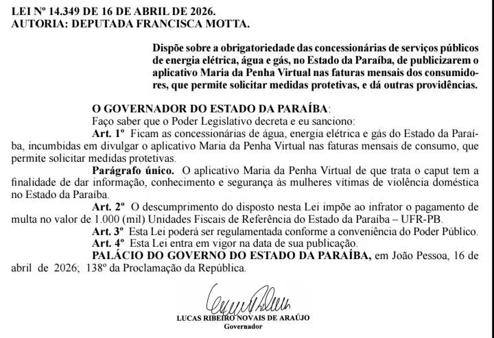 Foi sancionada ontem(16) pelo governador Lucas Ribeiro (PP), a Lei nº 14.349/2026, de autoria da deputada estadual Francisca Motta (Republicanos), que obriga concessionárias de energia elétrica, água e gás a divulgarem, nas faturas mensais, o aplicativo Maria da Penha Virtual.