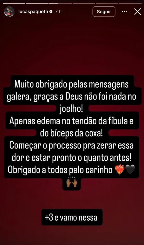 "Muito obrigado pelas mensagens, galera. Graças a Deus, não foi nada no joelho! Apenas edema no tendão da fíbula e do bíceps da coxa. Começar o processo para zerar essa dor e estar pronto o quanto antes. Obrigado a todos pelo carinho. Mais três pontos e vamos nessa", tranquilizou a torcida em mensagem nas redes sociais.