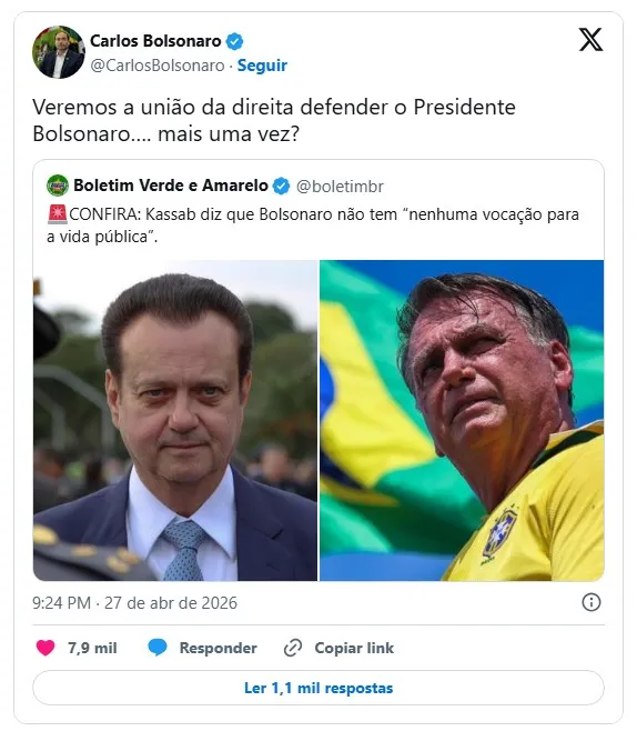 Pelas redes sociais, o pré-candidato ao Senado por Santa Catarina Carlos Bolsonaro (PL) compartilhou uma postagem no X que reproduz a fala de Kassab sobre "nenhuma vocação para a vida pública".