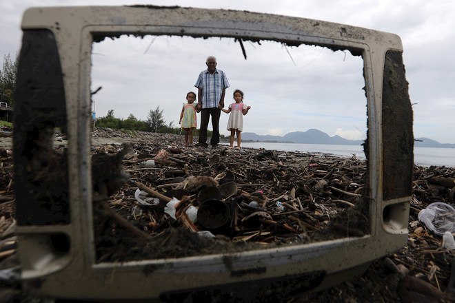 Um homem e duas crianças caminham entre o lixo que cobre a praia de Kampung Jawa em Banda Aceh, na Indonésia