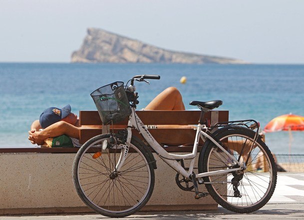 Uma pessoa toma banho de sol na praia do Levante, localizado no município de Benidorm, na Espanha